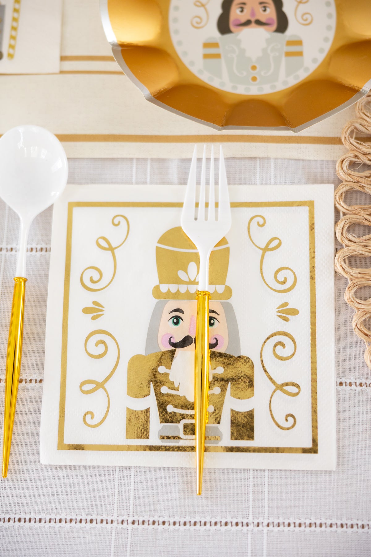 Elevate your holiday table into a professional tablescape with our new Gilded Nutcracker collection.These nutcracker cocktail napkins with shimmering gold foil accents will add a touch of glitz and glam to your holiday meal. With sleek design elements and charming details, your guests won't believe that they're disposable!