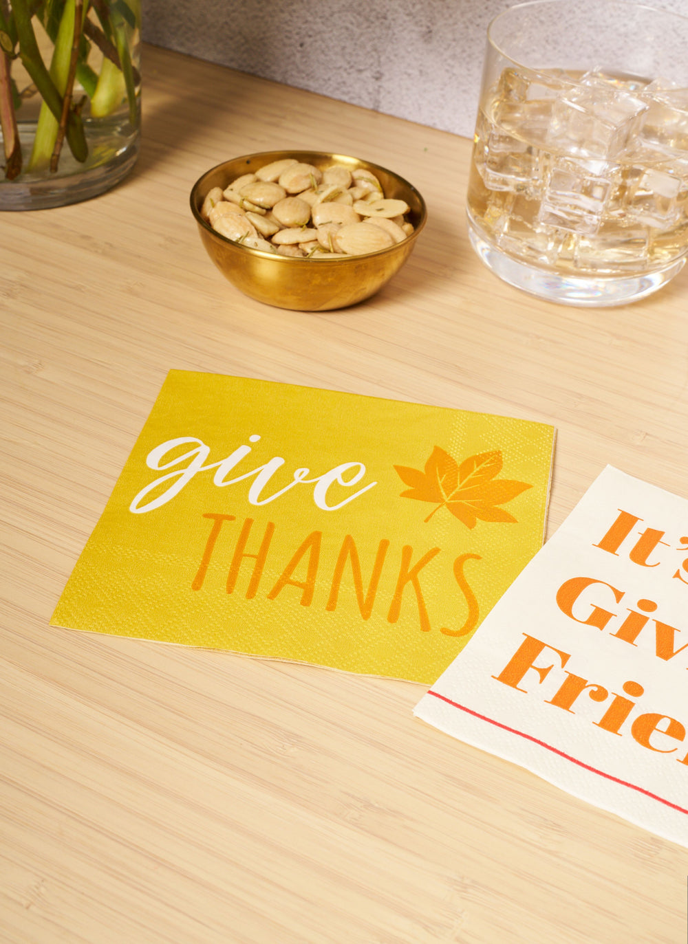 Add a touch of gratitude to your gathering with our 'Give Thanks' cocktail napkins—perfect for Thanksgiving sips, bites, and heartfelt moments. Whether used to hold appetizers or placed under your beverage at the dinner table, these napkins bring both practicality and elegance to your autumn celebrations.