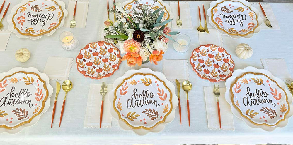 OMG It's Paper: Celebrate autumn with our Hello Autumn Collection, featuring pumpkins and foliage in the rich hues of the season. These elegant, scalloped edge plates will transform any table into a charming, Instagrammable tablescape. Create a memorable party your guests will "fall" for this season- they won't believe its all disposable!