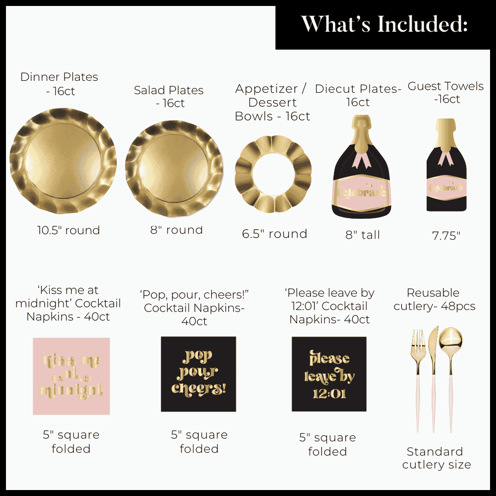 Bundle & Save 30%! We've curated the Ultimate New Years Eve party-in-a-box to make entertaining easy & Instagrammable. A curated tablescape, with everything you need to effortlessly create a professional, disposable, New Years Eve party. Skip the overpriced china without sacrificing style. Our designer disposable plates will save you time and money.