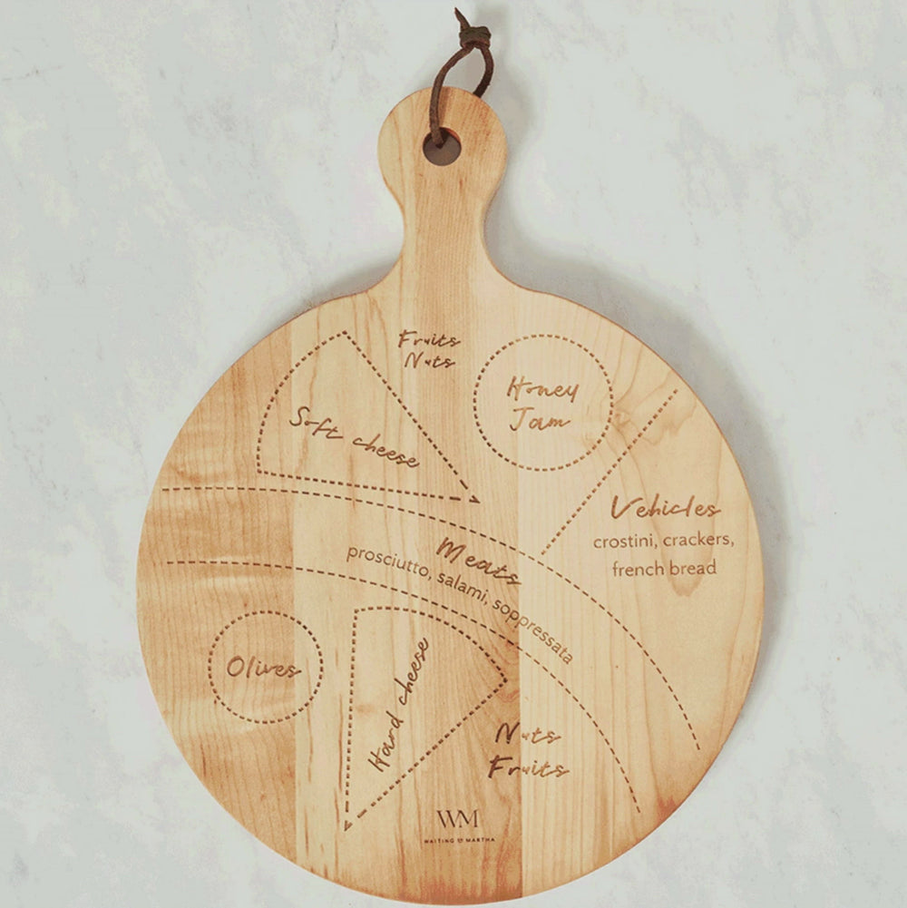 Ever Wonder How To Build The Perfect Cheeseboard? This Board designed by Mandy Kellogg Rye from Waiting On Martha Features An Engraved Road Map To Creating The Ultimate Cheese & Charcuterie Board With Suggestions For Where To Place Your Olives, Cheeses, And Condiments