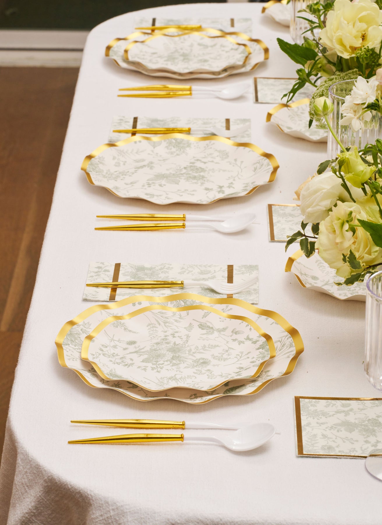 These ruffled salad plates feature a timeless floral pattern in green and a shimmering gold foil edge. These plates are both durable and disposable, allowing you to skip the dirty dishes, without sacrificing quality and style. Your guests will never believe they’re disposable!