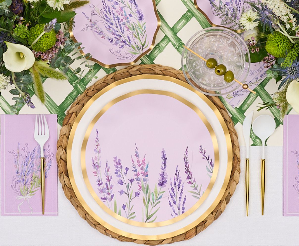 OMG It's Paper: Immerse your table in the serene beauty of the Lavender Fields collection. Featuring stunning purple and green imagery of blooming lavender, each piece is elevated with luxurious gold foil accents. Perfect for bringing a graceful, nature-inspired touch to any gathering.