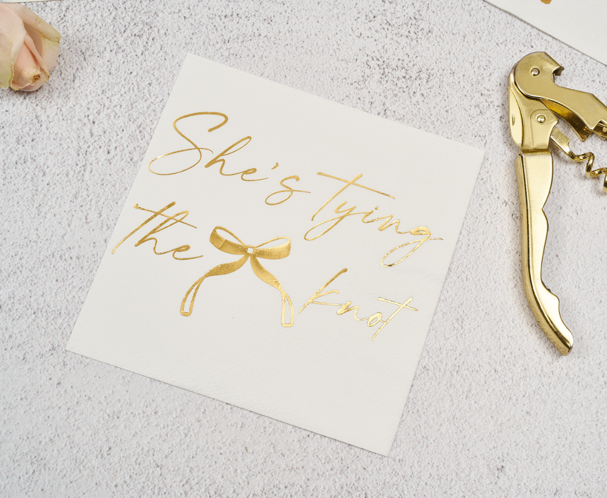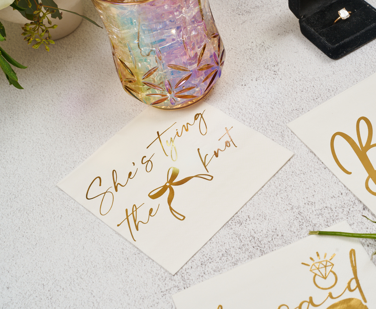 Celebrate the bride-to-be in style with these elegant gold-and-white cocktail napkins, perfect for bridal showers, engagement parties, and bachelorette festivities. Featuring shimmering metallic accents and a timeless design, they elevate every toast—from bubbly to signature cocktails. Use them for drinks, desserts, or as a chic detail on your tablescape—these napkins add the perfect touch of romance and sophistication to any bridal celebration.