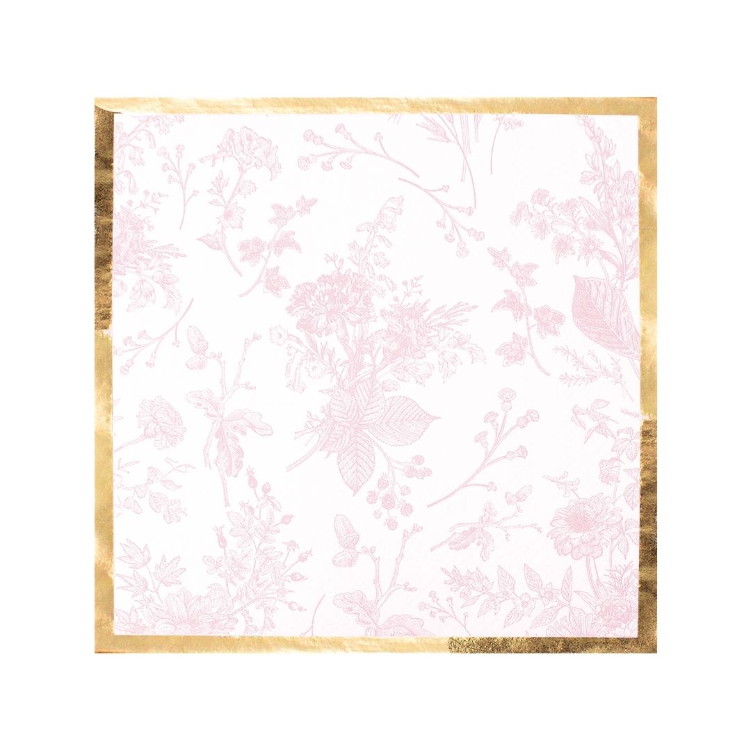 These timeless cocktail napkins feature a pink floral pattern and a gold foil border. They're the perfect way to elevate any gathering. Whether used to hold appetizers or placed under your beverage at the dinner table, these napkins bring both practicality and elegance to your celebrations.