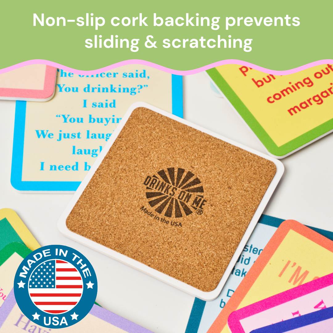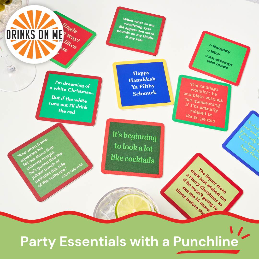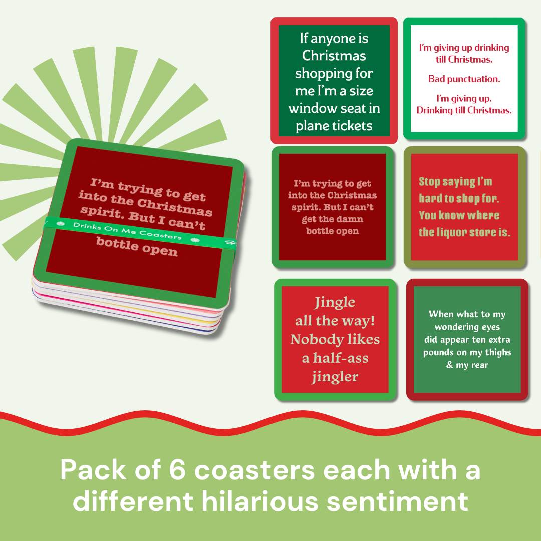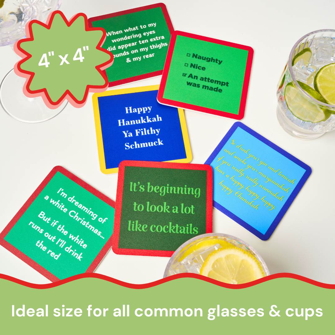 Get the party started (and the laughs rolling) with our Christmas Coaster Bundle. From laugh-out-loud one-liners to perfectly inappropriate punchlines, our coasters are the perfect stocking stuffer or hostess gift this holiday season! Printed in the USA on lightweight, ultra-durable resin, these coasters can handle even your most unfiltered friends. Whether you’re hosting girls’ night or just sipping solo with your dog—these coasters will make you literally LOL.