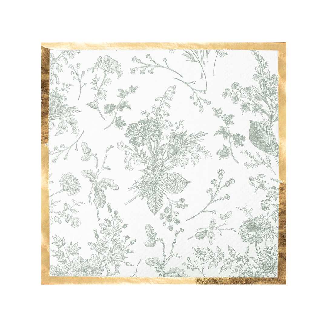 These timeless cocktail napkins feature a green floral pattern and a gold foil border. They're the perfect way to elevate any gathering. Whether used to hold appetizers or placed under your beverage at the dinner table, these napkins bring both practicality and elegance to your celebrations.
