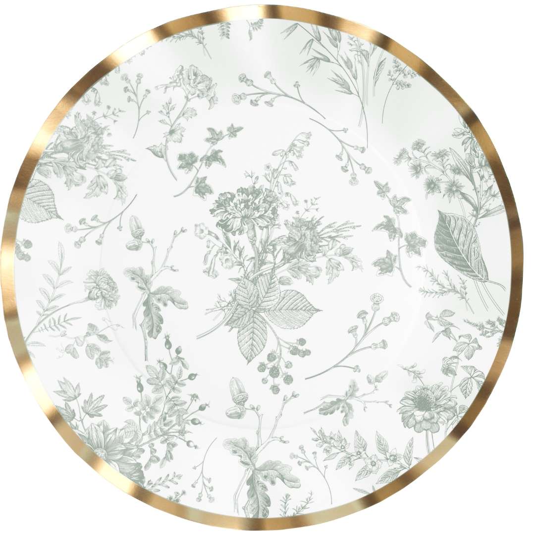 These scalloped-edge dinner plates feature elegant gold foil edges and a timeless floral pattern in green. They're a stunning addition to any gathering. These plates are both durable and disposable, allowing you to skip the dirty dishes, without sacrificing quality and style. Your guests will never believe they’re disposable!