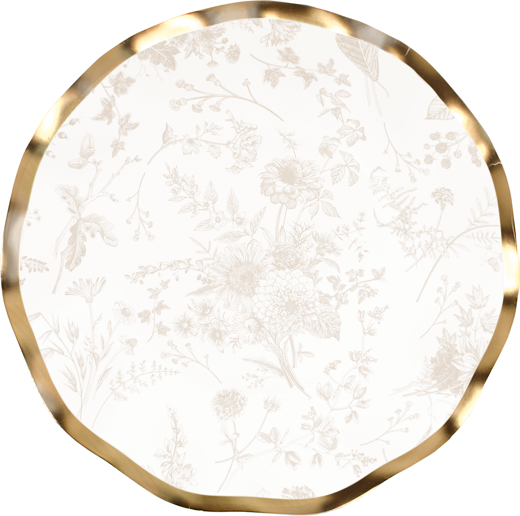 These ruffled salad plates feature a timeless floral pattern in beige and a shimmering gold foil edge. These plates are both durable and disposable, allowing you to skip the dirty dishes, without sacrificing quality and style. Your guests will never believe they’re disposable!