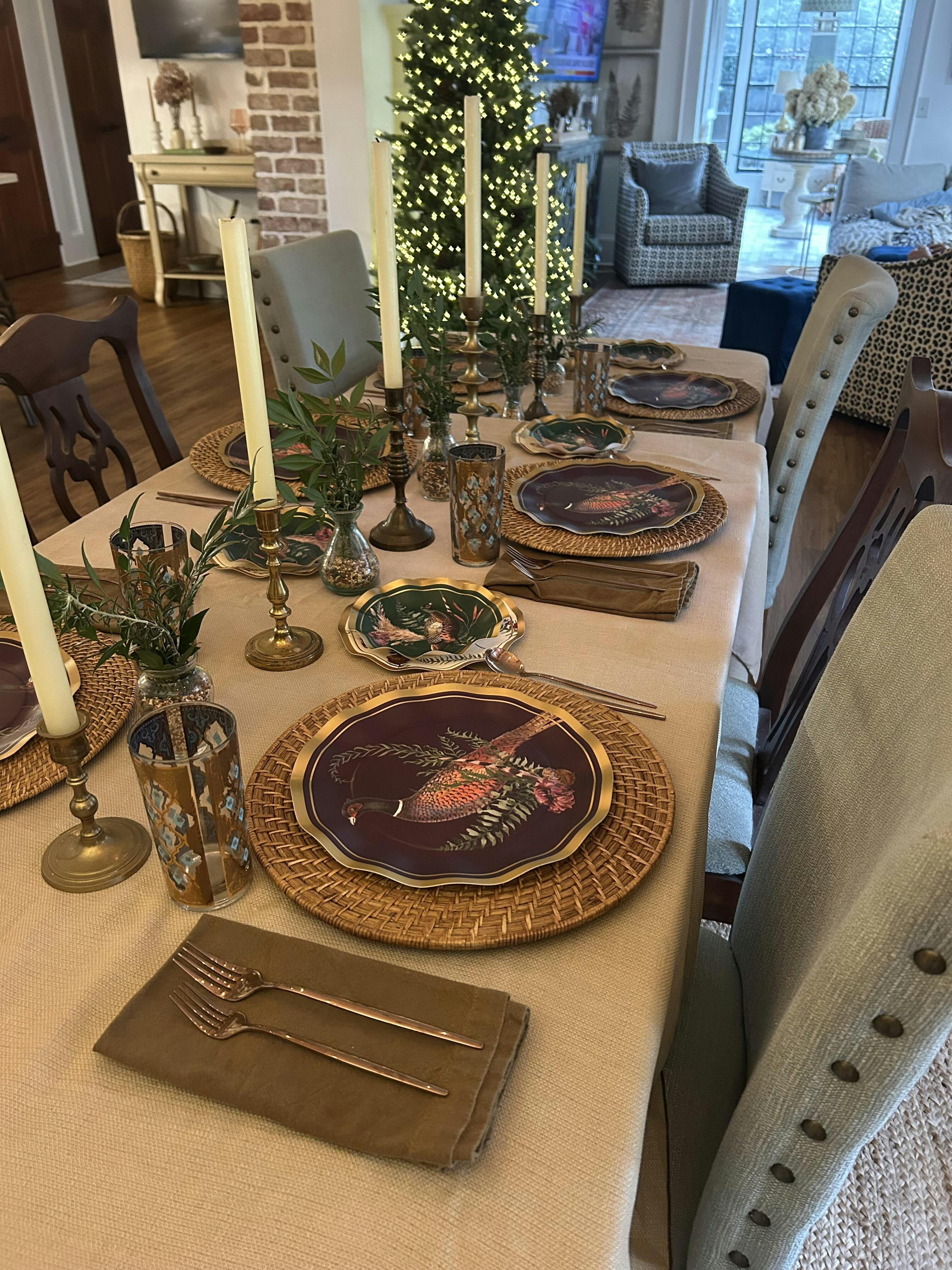 The set is so pretty. I also purchased plate chargers and cups. My guests were so impressed and it made cleaning up so much easier. I’ve already purchased a different set for Christmas dinner!! Thanks!!!