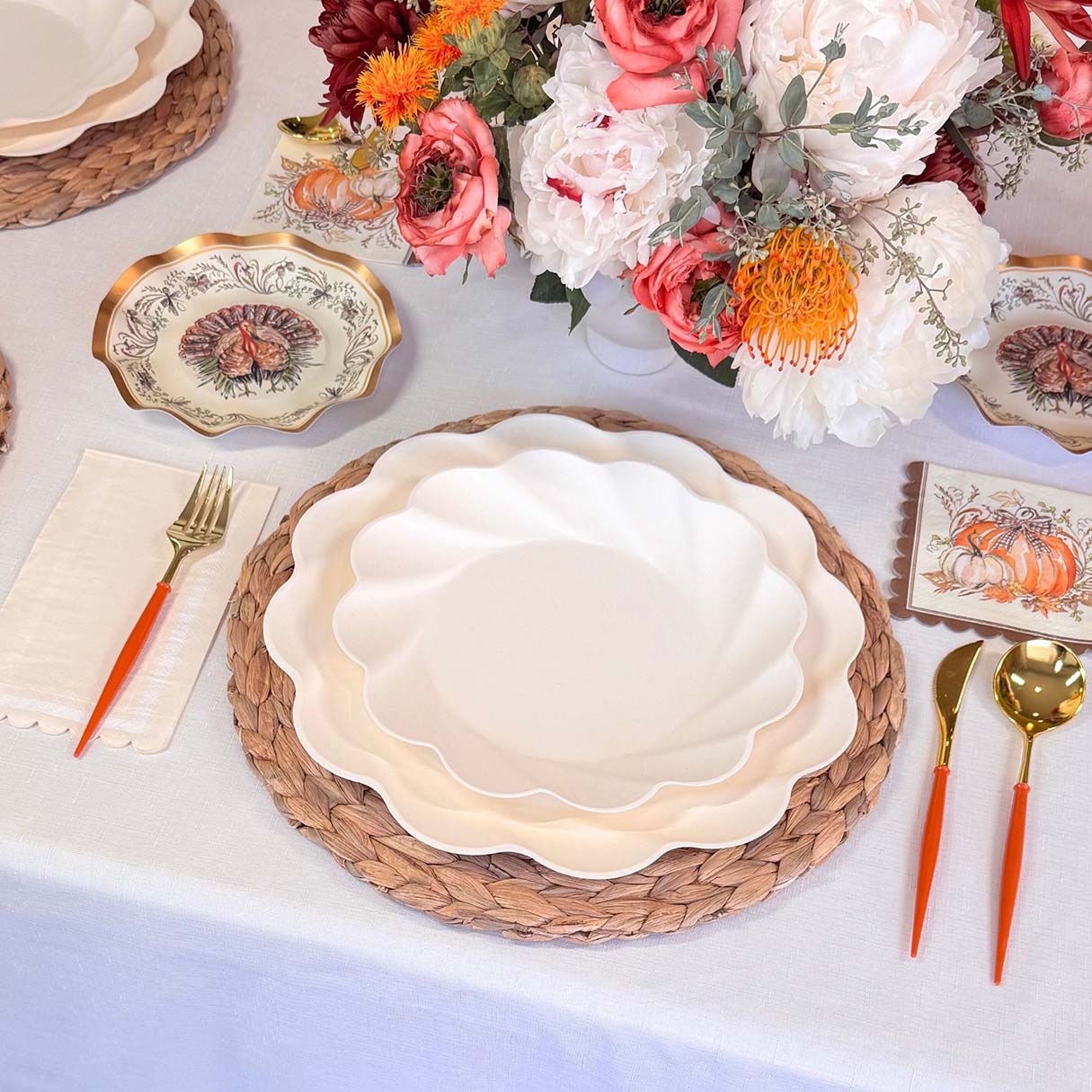 Celebrate the heart of harvest season with our Ivory Harvest Collection. Featuring our beautiful new line of eco-friendly and compostable plates, this collection brings sustainability and style to your table. Instead of paper, these elegant ivory plates are made from natural bamboo, wood fiber, and sugarcane, making them not only environmentally friendly but also incredibly sturdy and durable.