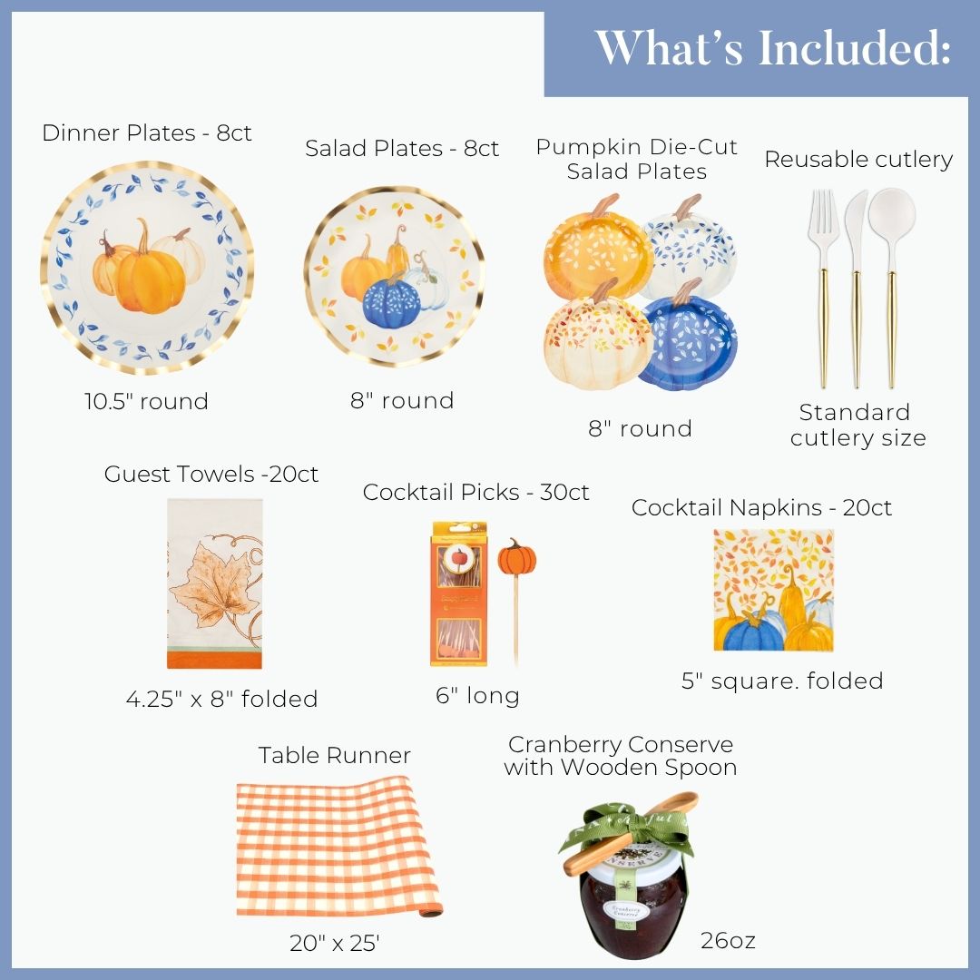 β’ 8 Pumpkin Die-Cut Salad Plates:Β 8"x 8" heavy duty paper for salads and side dishes.Β